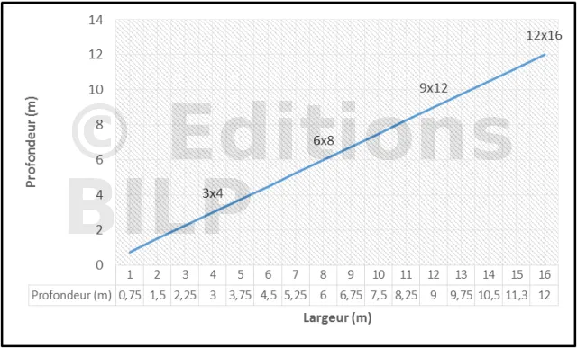 Dans la théorie générale de construction, suivre le ratio 3/4 donne de bons résultats. Pour cela, voir le graphe suivant. Par exemple une cabane de 3 m de profondeur sur 4 m de large ou encore une cabane de 6 m de profondeur se marie très bien avec une largeur de 8 m.