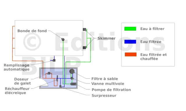 Pour que les machines soient sollicitées au minimum, il est essentiel de placer le moteur au niveau de la piscine, de préférable sur le même plan que les voies de sortie et d’entrée d’eau du bassin.
