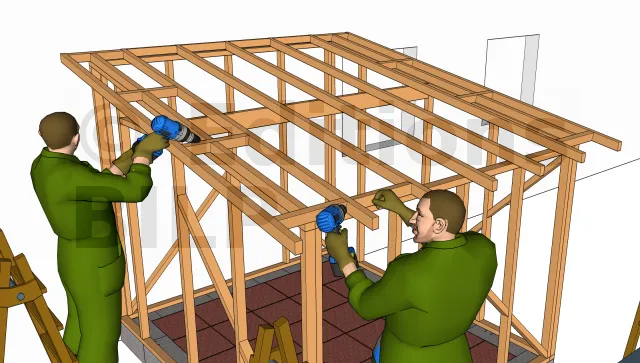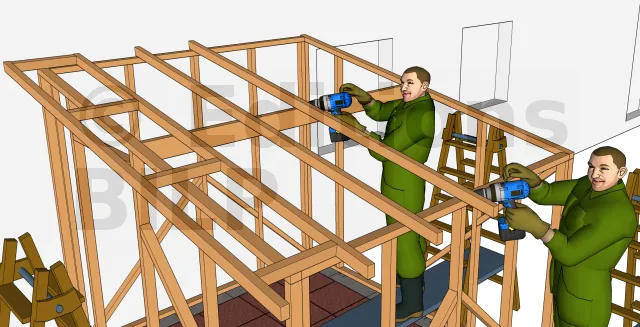 Poser maintenant les entretoises qui serviront d’appuis aux chevrons des extrémités. Utiliser des vis D6L100 pour la fixation.