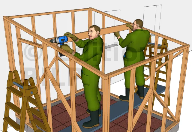 La charpente de la toiture de la cabane est très simple, on aura besoin que d’une seule unité de panne. Découper-la à la bonne longueur puis fixer avec un montant de chaque mur latéral pour bien reprendre les charges.