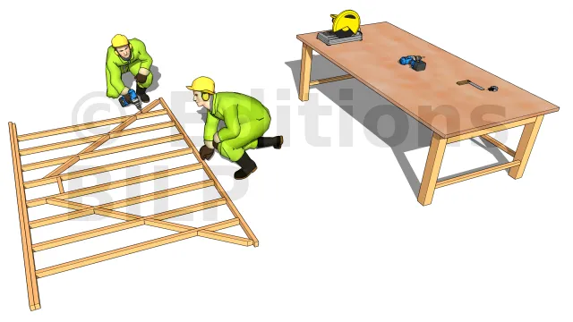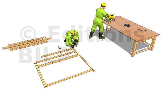 • Pour les contreventements, vous pouvez facilement repérer les découpages en simulant ses positions et traçant au crayon les lignes à couper ou prendre un angle de 45° tout simplement. Aidez-vous d’une scie à angle pour cela.