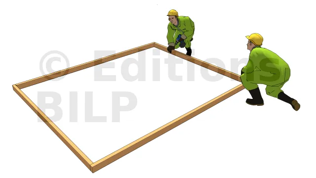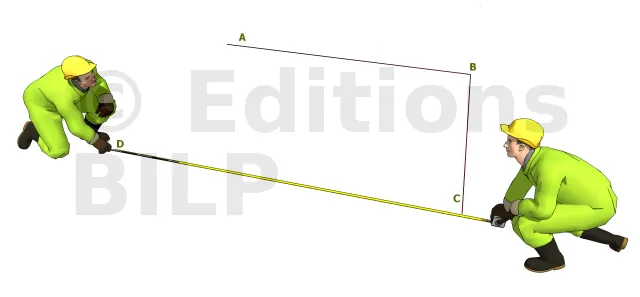 Repérer au sol la surface prise par les ossatures. Prendre un point A (Point de devant principale droit de l’atelier) de départ et rapporter la première longueur de la lisse latérale en traçant une ligne droite à l’aide de cordon (3,60m jusqu’au point B, point de devant latéral gauche). Prendre ensuite le troisième coin (point C, point de derrière latéral gauche) en mesurant la diagonale du premier triangle (4,56m) et la distance entre les deux points de la façade principale (2,80m). Le quatrième point D (point de derrière latéral droite) s’obtient facilement en mesurant 2,80m du point A et 3,60m du point C. Là, vous avez les 4 coins extérieurs des lisses.