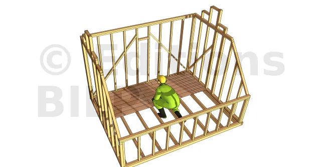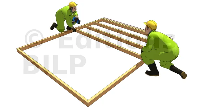Poser et fixer d’abord les cales pour le plancher puis les entretoises.