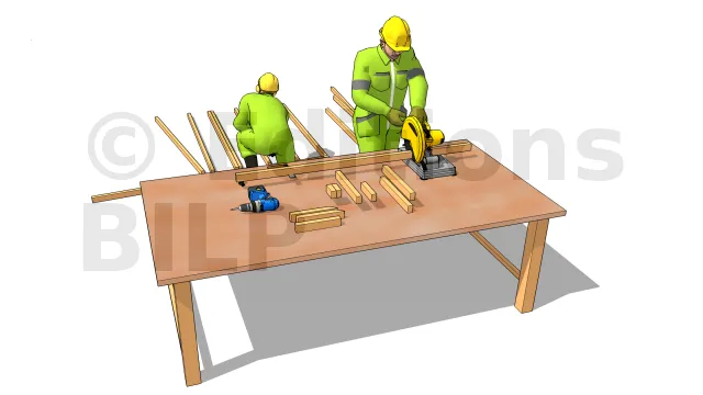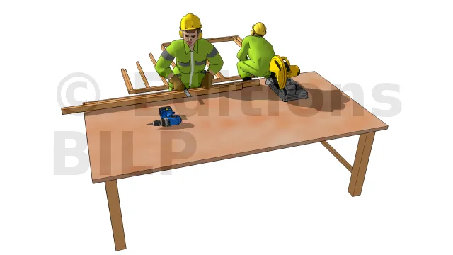 • Pour les contreventements, vous pouvez facilement repérer les découpages en simulant la position des contreventements et traçant au crayon les lignes à couper ou prendre un angle de 45° tout simplement. Aidez-vous d’une scie à angle pour cela.
