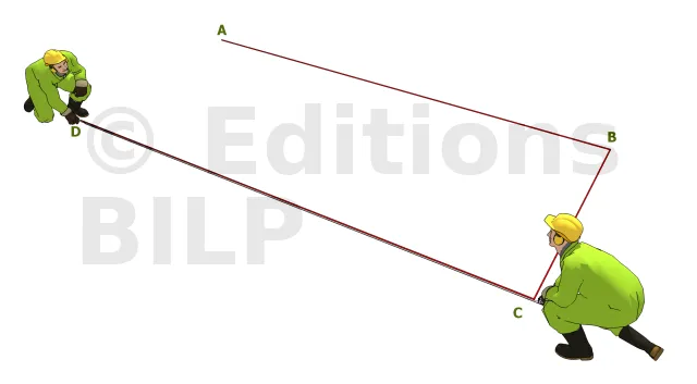 Repérer au sol la surface prise par les ossatures. Prendre un point A (Point de devant principale droit de l’atelier) de départ et rapporter la première longueur de la lisse latérale en traçant une ligne droite à l’aide de cordon (6 m jusqu’au point B, point de devant latéral gauche). Prendre ensuite le troisième coin (point C, point de derrière latéral gauche) en mesurant la diagonale du premier triangle (6,62 m) et la distance entre les deux points de la façade principale (2,80 m). Le quatrième point D (point de derrière latéral droite) s’obtient facilement en mesurant 2,80m du point A et 6 m du point C. Là, vous avez les 4 coins extérieurs des lisses.