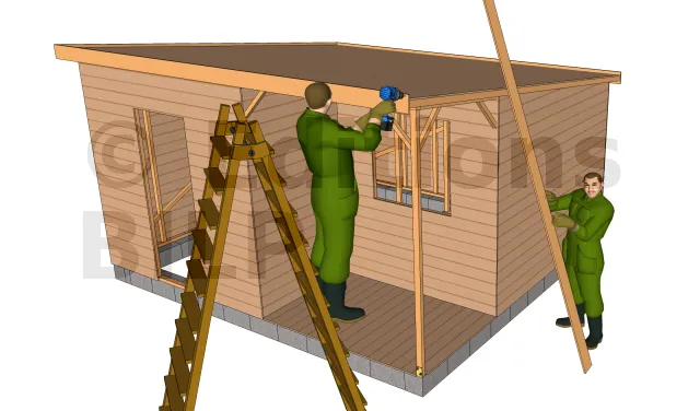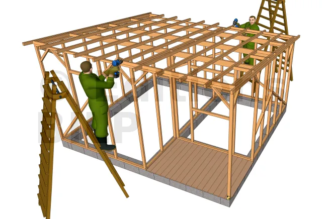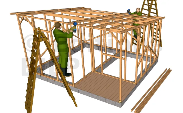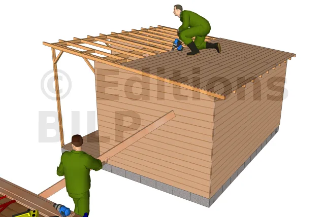 Poser maintenant les entretoises qui serviront d’appuis aux chevrons des extrémités, utilisez des vis D6L100. Installez les chevrons et vissez.