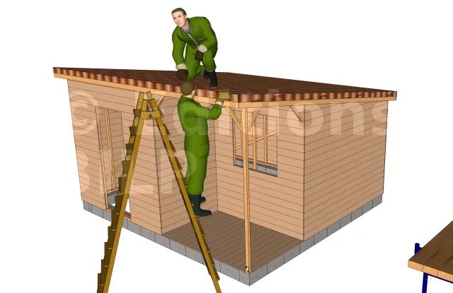 En premier lieu, fabriquez deux gabarits qui auront les mêmes mesures que les distances entre les chevrons prescrits dans le plan. Réalisez des découpes car les bouts des chevrons seront en biais. Posez les chevrons intermédiaires et fixez-les aux lisses hautes avec des équerres de renfort.