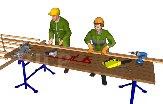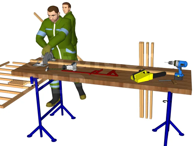 La construction de la cabane commence par la découpe des éléments nécessaires pour la réalisation des murs. Pour être précis dans les coupes, vous devriez vous munir des plans d’exécution. Concernant les montants des façades principales et de derrière, il faut être méthodique pour le tracé de la ligne de coupe. Poser côte à côte les montants puis mesurer la longueur utile, aidez-vous d’une équerre pour tracer la ligne et le tour est joué.