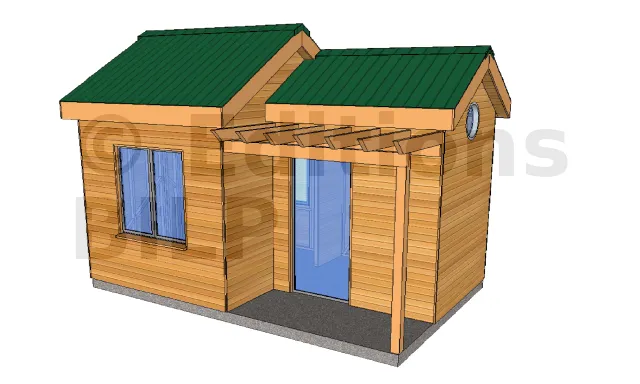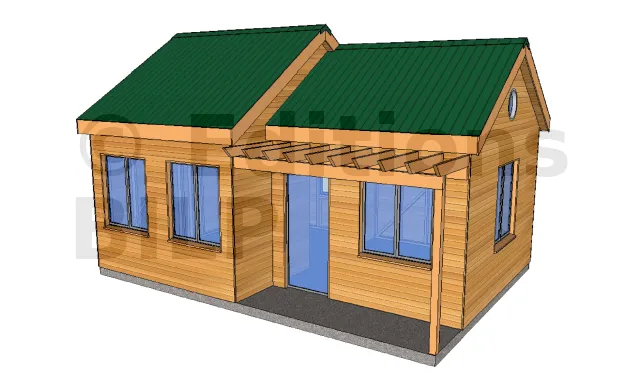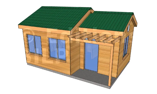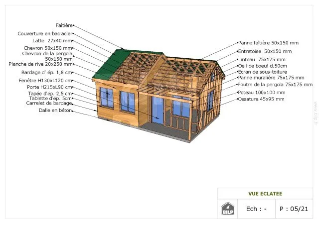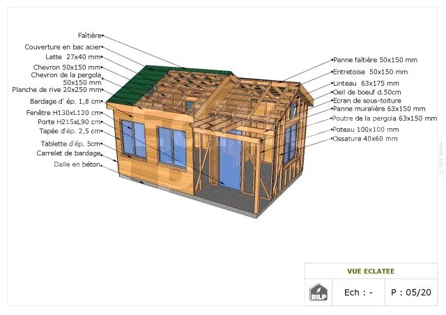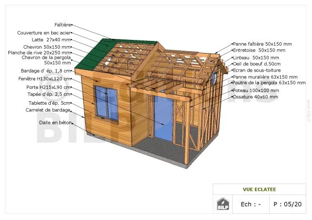 La cabane est composée d’une toiture à double pente et à deux niveaux ainsi que d’une véranda munie d’une pergola. C’est un bâtiment composé de deux locaux spacieux aménageables en petit habitation, en bureau, en atelier ou en lieu de stockage.